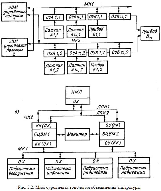 Многоуровневая топология зачастую используется в том случае, когда требования изолированности не позволяют строить систему на основе одного канала. Например, разделение идентичных каналов системы управления полетом позволяет обеспечить необходимый уровень надежности и изолированности путем замены одноуровневой топологии эквивалентной многоуровневой (рис. 3.2, а). В этом случае большую роль играет правильный выбор места подключения датчиков и исполнительных механизмов с учетом различных требований резервирования.